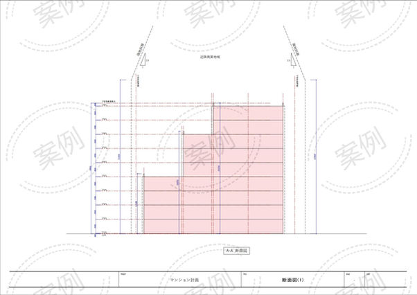 各階の階高、建築物の最高高さ、道路斜線、高度斜線、北側斜線、および隣地境界線を表現します。